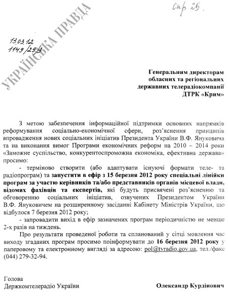 В нем глава Государственного комитета Александр Курдинович обращается к руководителям телерадиокомпаний "срочно создать (или адаптировать существующие форматы теле- и радиопрограмм) и запустить в эфир с 15 марта 2012 специальные линейки программ с участием представителей органов местной власти, известных специалистов и экспертов, которые будут посвящены разъяснению и обсуждению социальных инициатив президента В.Ф. Януковича".