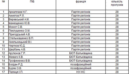 Большинство депутатов, которые без уважительных причин пропустили все пленарные заседания парламента в первом квартале 2012 года, являются членами фракции Партии регионов.