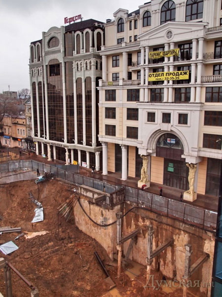 В то же время, по информации МЧС, из бизнес-центра, находящегося в 5 метрах от котлована, эвакуировали 210 человек. Перекрыта также проход с близлежащей улицы Бунина на Греческую площадь. Спасатели подчеркнули, что на колоннах бизнес-центра визуально наблюдаются трещины.