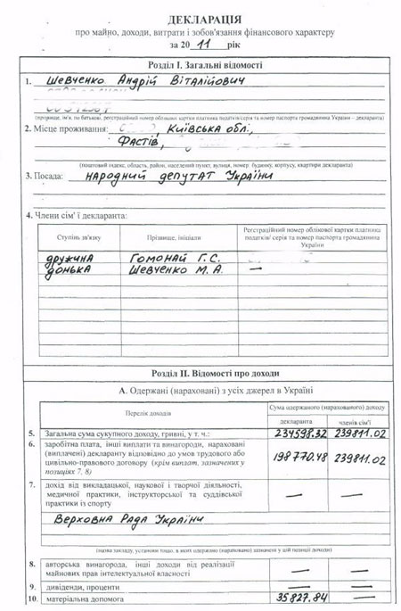 Совокупный доход депутата от БЮТ Андрея Шевченко за 2011 год составил 234 тысячи 598 гривен.
