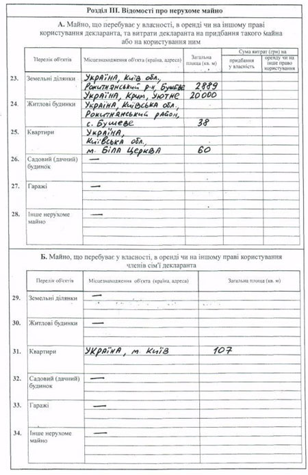 Депутат владеет двумя земельными участками - в Киевской области и в Крыму, а его жена - квартирой в Киеве площадью 107 квадратных метров.