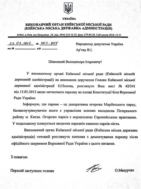Мазурчак также добавил, что КГГА готова рассмотреть вопрос демонтажа забора после официального обращения Верховной Рады по этому вопросу.