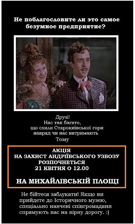 Участники акции потребуют возбуждения уголовного дела против чиновников, которые допустили разрушение домов на Андреевском спуске и восстановления этих сооружений; отставки всех руководителей, отвечающих за защиту культурного наследия и исторического облика Киева.