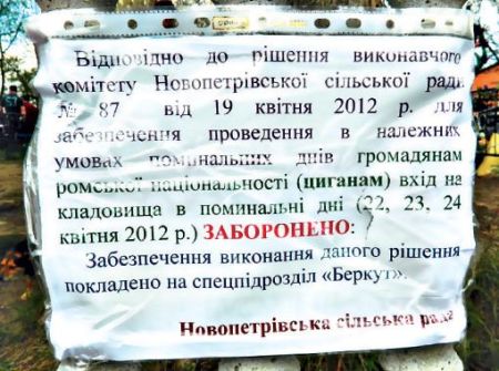 "В соответствии с решением исполнительного комитета Новопетровского сельского совета №87 от 19 апреля 2012 года для обеспечения проведения в надлежащих условиях поминальных дней гражданам ромской национальности (цыганам) вход на кладбища в поминальные дни (22, 23, 24 апреля 2012 г.) запрещен", - гласит вывеска.