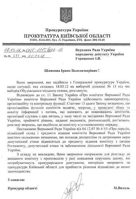 "Учитывая изложенное, Ваше обращение направлено для рассмотрения указанному комитету с предложением в случае выявления нарушений закона, которые будут требовать прокурорского реагирования, материалы направить прокуратуре Киевской области для принятия решения согласно требованиям законодательства", - отметил он.