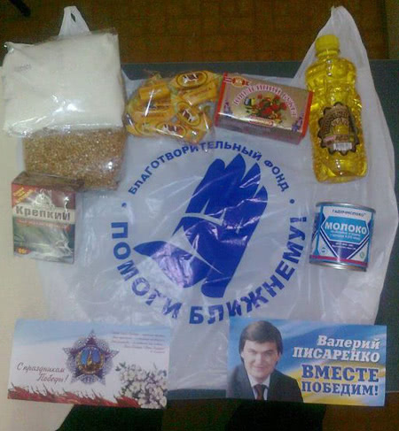 Такие же наборы раздавал другой депутат Валерий Писаренко, который также намерен баллотироваться по мажоритарному округу в Харькове.