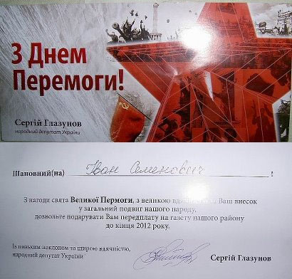 "К продуктовому набору прилагалась открытка "С Днем победы!" с подпиской на районную газету, в которой полным ходом идет пиар того же народного избранника", - отметил он.