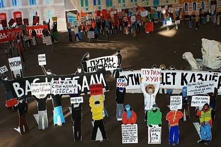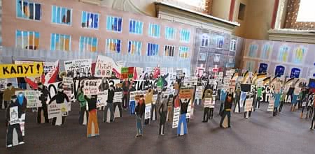 Как написала в своем блоге Джанян, после того, как установка была смонтирована, художники покинули зал, и через два часа, прямо перед началом пресс-конференции, обнаружили, что часть человечков с антипутинскими плакатами изъята. При этом все плакаты, по ее словам, - это народное творчество.
