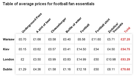 Как пишет The Sun, такие маленькие радости болельщиков как пиво, бутылка воды, гамбургеры, мяч, футболки и дудка обойдутся в среднем на 51 процента меньше в принимающих странах Евро-2012, чем в Великобритании.