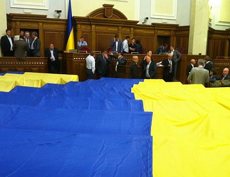 В свою очередь депутаты из фракции Блока "Наша Украина-Народная Самооборона" накрыли свои места в сессионном зале огромным государственным флагом.