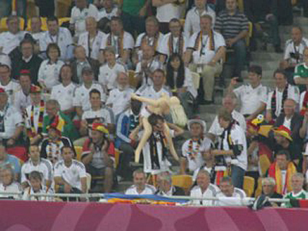 Немецкие болельщики на стадионе "Арена-Львов" во время матча Германия-Португалия в субботу на одной из трибун имитировали секс с надувной женщиной, передавая ее друг другу.