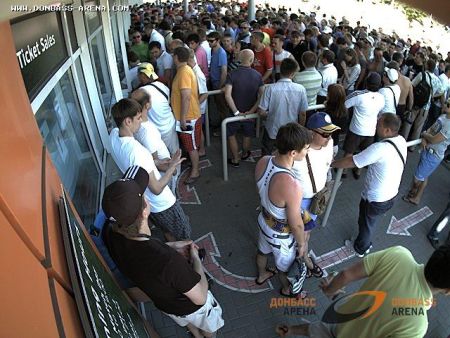В Донецке за три часа до начала матча "Евро-2012" Англия - Франция у касс "Донбасс Арены" уже наблюдается столпотворение болельщиков.