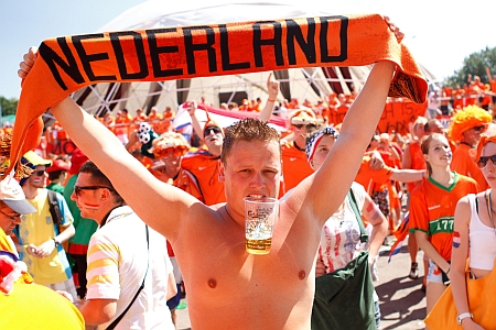Большинство участников были одеты в оранжевую одежду цвета национальной сборной, карнавальные костюмы, несли национальные флаги.