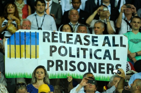 Они принесли с собой плакаты с надписями "Release all political prisoners" (Освободите всех политических узников) и "Fairplay in football and politics" (Честная игра в футболе и политике).