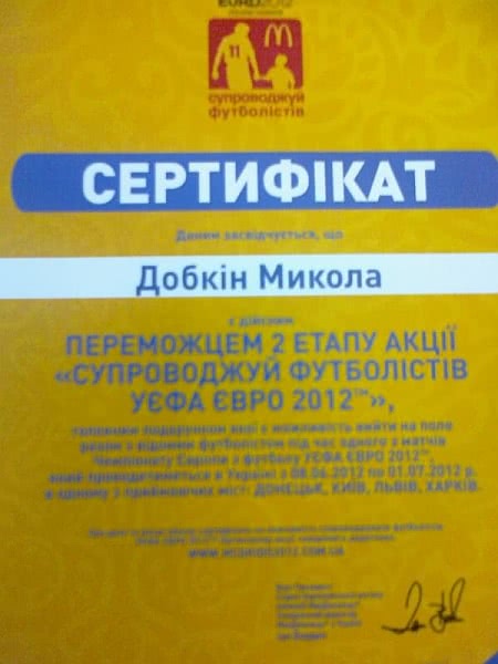 Кроме того, чиновник опубликовал сертификат сына о победе в акции "Сопровождай футболистов УЕФА Евро-2012".