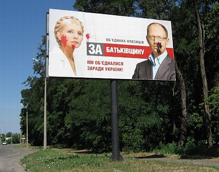 На выходных в Черкассах неизвестные повредили 26 из 32 билбордов "За Батькивщину", где изображены Юлия Тимошенко и Арсений Яценюк.