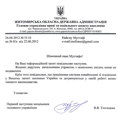 В частности, речь идет о письме первого заместителя начальника главного управления труда и социальной защиты населения Житомирской облгосадминистрации Валентины Усольцев.