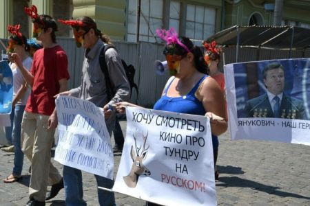 По словам участников акции, они не поддерживают новый языковой закон и требуют от президента его не подписывать.