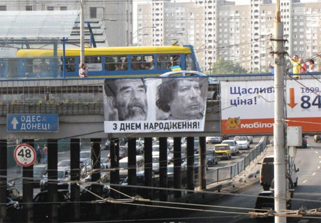В нескольких местах в Киеве неизвестные вывесили поздравление Януковичу с изображением ливийского лидера Муаммара Каддафи, который был убит прошлой осенью.