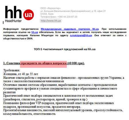 Позже Украинская правда получила сообщение, где указывалось, что в "ТОП-5 "нетипичных" предложений работы" советника ищут президенту международного холдинга.