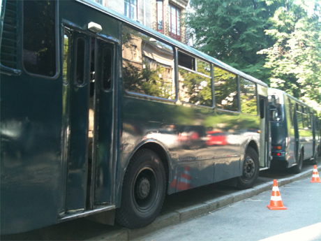 Непосредственно перед судом стоят несколько автобусов с правоохранителями.