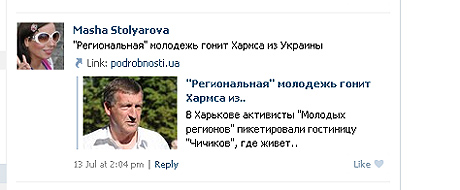 Тогда Молодые регионы заявили, что не имеют отношения к этой акции. Однако в своем Вконтакте, Столярова разместила ссылку на сообщение об их акции и дописала: "Региональная" Молодежь гонит Хармса".