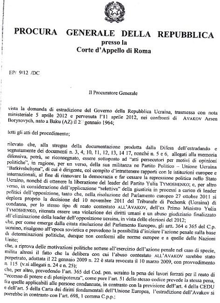"В соответствии со статьей 705 Уголовно-процессуального кодекса; просит Апелляционный суд заявить, что причины для экстрадиции Авакова Арсена Борисовича, уроженца г. Баку (Азербайджан) 2 января 1964 года рождения, в Украину отсутствуют", - сказано в выводах ГПУ Италии.