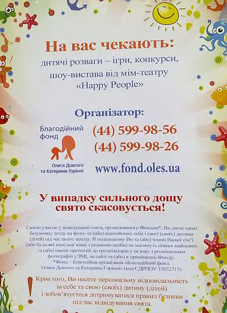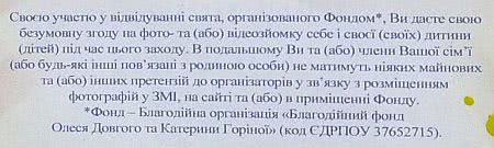 "Своим участием в посещении праздника, организованного фондом, вы даете свое безусловное согласие на фото- и (или) видеосъемку себя и своего (своих) ребенка (детей) во время этого мероприятия. В дальнейшем вы и (или) члены вашей семьи (или другие связанные с семьей лица) не будете иметь никаких имущественных и (или) иных претензий к организаторам в связи с размещением фотографий в СМИ, на сайте и (или) в помещении фонда".