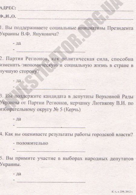 Анкета содержит вопросы, поддерживают ли керчане социальные инициативы президента Виктора Януковича, поддерживают ли они кандидата в депутаты Валентину Лютикову, вопрос с ошибкой "Вы примите участие в выборах народных депутатов Украины" и другие.