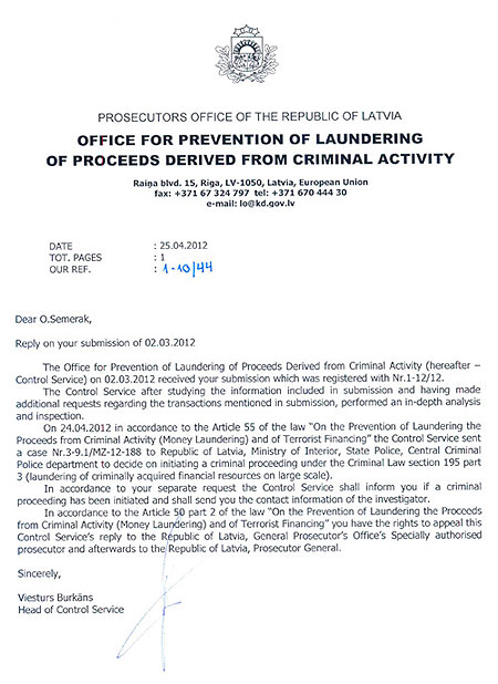 В письме к нему Генпрокуратура Латвии сообщила о передаче данного дела в Министерство внутренних дел, Государственную полицию, Центральную криминальную полицию для "возбуждения уголовного дела по факту отмывания полученных преступным путем средств в особо крупных размерах".