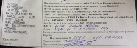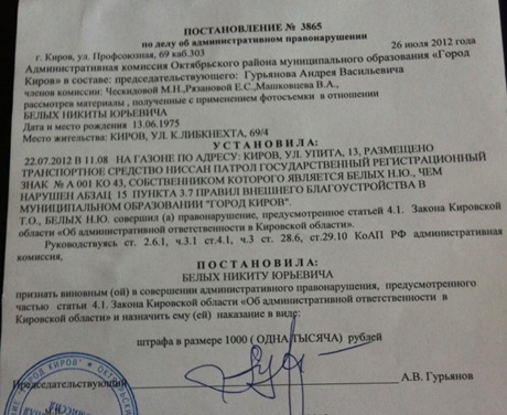 В посте за 1 августа Белых выложил постановление административной комиссии Октябрьского района города Киров, в котором она, рассмотрев предоставленные фотоматериалы, установила факт административного нарушения и постановила признать губернатора виновным и заплатить штраф в размере 1000 рублей.