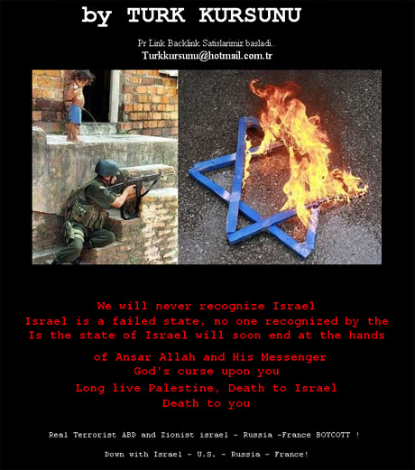 Состоянием на 8:00 четверга на сайте областного ГАИ есть надпись "Взломано Турком Курсуну" (Hacked by TURK KURSUNU), электронный адрес хакера, две фотографии, на одной из которых изображен маленький мальчик, который справляет малую нужду на голову солдата, который находится в засаде, а на второй – горящая звезда Давида.