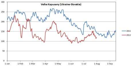 На графике суточных потоков через основной экспортный терминал – Велке Капушаны на границе Украины и Словакии – видно, что экспорт резко упал с 19 января (231 млн. куб м) по 4 февраля (118 млн.) и превысил уровень в 200 млн. куб м только 16 февраля, когда период экстремальных холодов уже закончился.