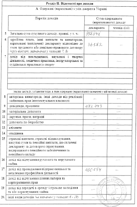 Дивиденды и проценты составляют 472 743 гривни из этого дохода. Доход от предпринимательской деятельности составляет 490 054 гривни.