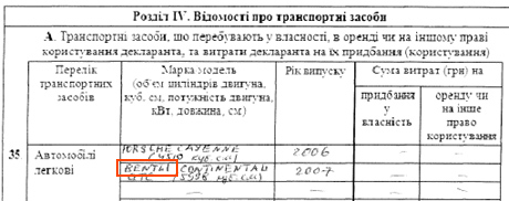 У Донец есть две машины: Porshe Cayenne 2006 года объемом двигателя 4510 куб. см. и Bentlley Continental GTC 2007 года с объемом двигателя 5998 куб.см .