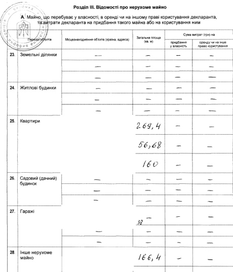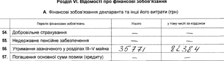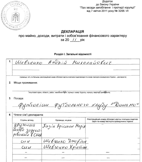 В 2011 году Шевченко уплатил за содержание имущества 35 771 гривен, в том числе за границей 82 384 гривни.