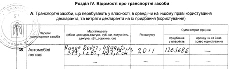 Также у Шевченко есть автомобиль Range Rover 2011 года выпуска с объемом двигателя 5 литров стоимостью 1 265 686 гривен.