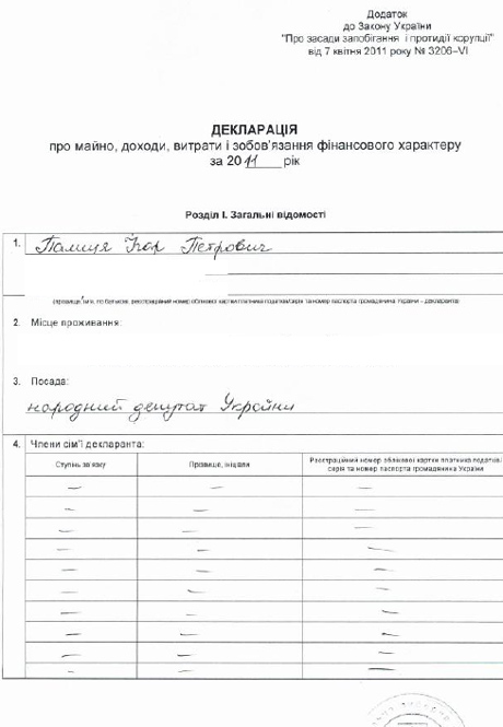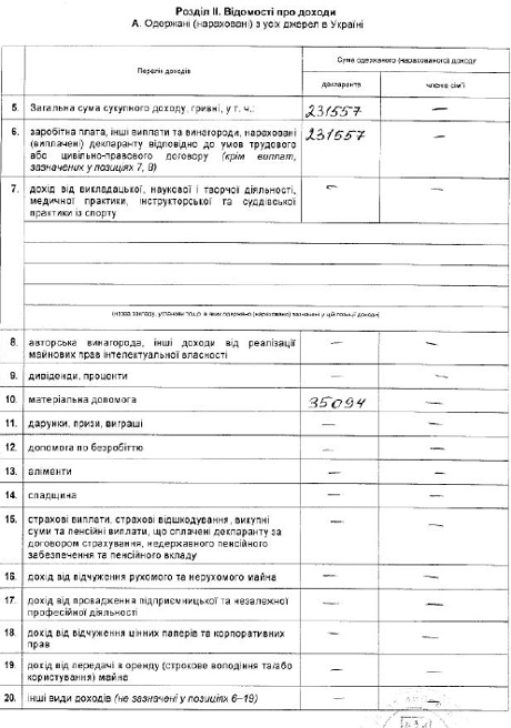 Согласно документу, в 2011 году он заработал 231 557 гривен, которые составили его зарплату. Также он получил 35 094 материальной помощи.