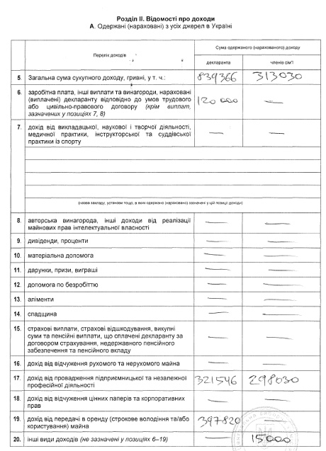 Из них заработная плата составляет 120 тысяч гривен, доход от предпринимательской деятельности – 321 тысяча 546 гривен, доход от передачи в аренду 397 тысяч 820 гривен.