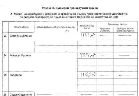 Ющенко владеет земельным участком площадью 1141 кв.м., дом площадью 425 кв.м. и квартиру 116,2 кв.м. Вместе с тем семья племянника экс-президента имеет в собственности земельный участок площадью 1977 кв.м. и дом площадью 125 кв.м.