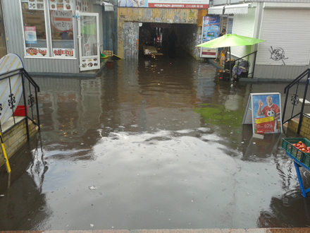 В четверг через непродолжительный, но сильный дождь в Киеве были заблокированы пешеходные подходы и подземные переходы к станции метро "Позняки".