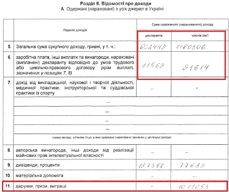Так, согласно декларации, крупнейшей статьей дохода судьи Джарты стали указаны в декларации "подарки, призы и выигрыши". В этом разделе значится 1 миллион 11 тысяч гривен.