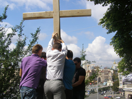 Около Октябрьского дворца в Киеве группа активистов установила временный поклонный крест на месте спиленного участниками движения FEMEN.