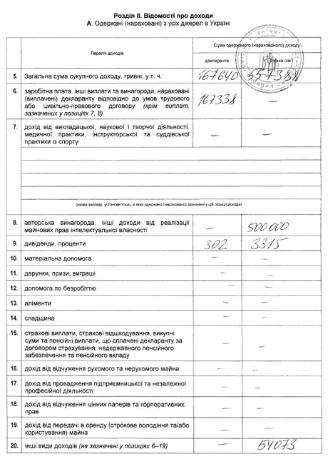 Из всего дохода 167 тысяч 338 гривен составляет зарплата и 302 гривны – дивиденды и проценты.