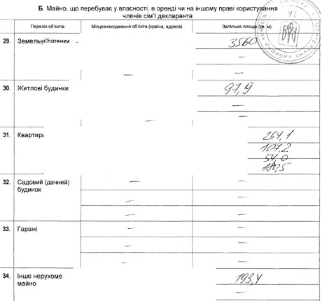 Родственники нардепа владеет земельным участком площадью 3560 кв. м, жилым домом площадью 97,9 кв. м, 4 квартиры - площадью 264,1; 107,2; 54 и 180,5 кв. м и другим недвижимым имуществом площадью 193,4 кв м.