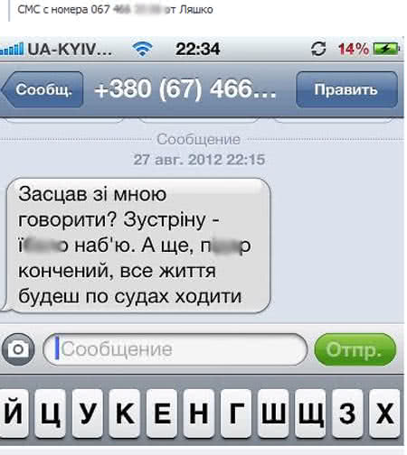 "Моя публикация о политическом проекте "Ляшко" сегодня получила продолжение. Только что позвонил мне Ляшко. Кто-то слил ему номер моего мобильного. Ругался матом. Обзывался и угрожал. Пришлось разговор прекратить. Ну, не вступать же в перепалку. Получил в результате смс: "Зассал со мной говорить? Встречу, е**ло набью. А вообще, п**р оконченный, всю жизнь будешь по судам ходить", - процитировал Гайдай.