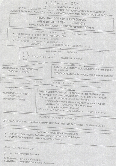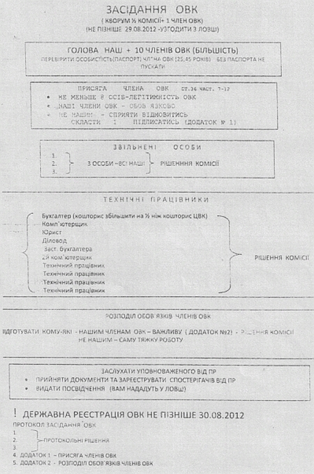 "Штаб рекомендует во время проведения заседаний "не нашим" членам ОИК способствовать отказаться от принятия присяги. Есть серьезные предложения о назначении технических работников - персонально по фамилиям. Штаб Партии регионов рекомендует давать предложения всех "наших". Если председатель ОИК не является представителем правящей партии, то те люди, которые предлагаются на технических работников, должны быть "зарезаны" во время процесса голосования", - уточнила политик.