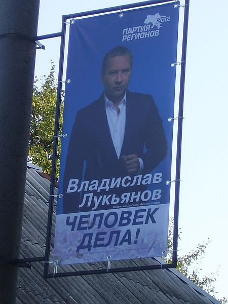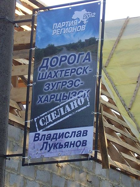 Кандидат в депутаты от Партии регионов Владислав Лукьянов разместил в городе Харцызск Донецкой области плакаты со своей фамилией и информацией о ремонте дорог и больницы.