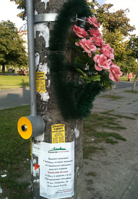 Кандидат в депутаты от Партии регионов Валерий Борисов пропиарился на 1 сентября на открытии светофора на Троещине в Киеве.