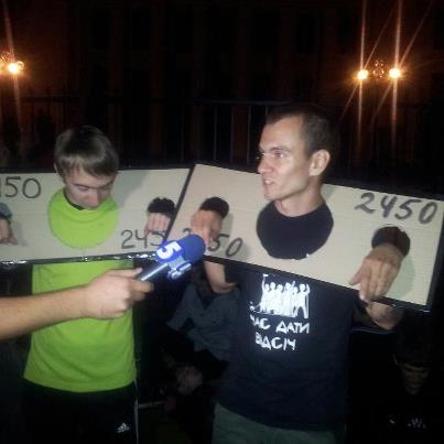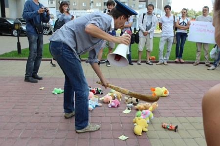 Участники акции разыграли на площади своеобразный перформанс. Выложив на мостовую игрушки с надписями на бумажках "Право на мирный протест" и "Нет - 2450", один из активистов "превратился" на милиционера и размел веником все игрушки в разные стороны.